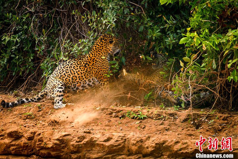 当地时间2012年11月14日,巴西Pantanel,摄影师Octavio Salles拍摄到了两只美洲豹打架的精彩场面,这两只美洲豹扭打在一起,战况惨烈,其中的一只美洲豹咄咄逼人,将另外一只逼近了灌木丛中。图片来源:东方IC 版权作品 请勿转载