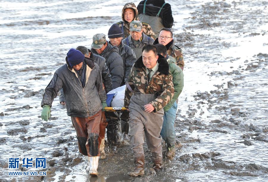 11月28日,在辽宁省大连市金州新区杏树屯猴石渔港,救援人员抬着一名遇难者的遗体走向岸边。当日凌晨,大连金州新区附近一渔船翻船沉没,船上17人只有1人获救,其他16人失踪。截至发稿,已打捞出12具遗体,目前有关方面正在搜救。图片来源:新华网