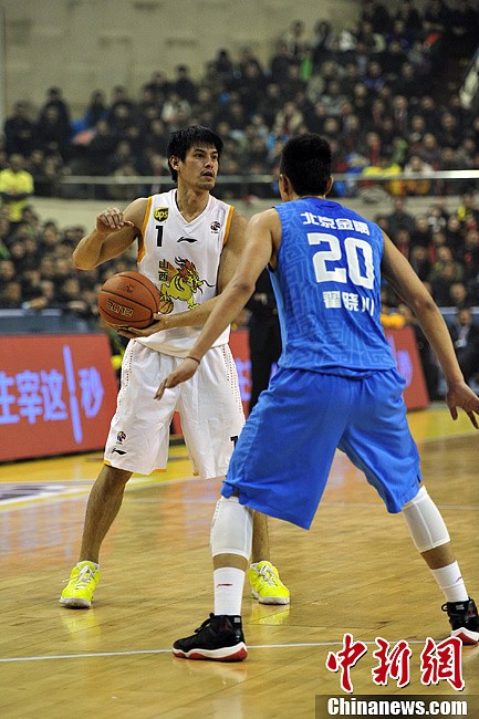 11月14日晚,CBA联赛第九轮打响,山西汾酒集团主场山西滨河体育中心迎战来访的卫冕冠军北京金隅。尽管山西在比赛中一度落后16分,但凭借着台湾球员杨敬敏常规时间献出一记高难度关键打板三分扳平比分,将比赛拖进加时。最终山西以121:117战胜卫冕冠军北京。山西取下了队史最长的六连胜。图为台湾球员杨敬敏(白)在比赛中组织进攻。张云 摄