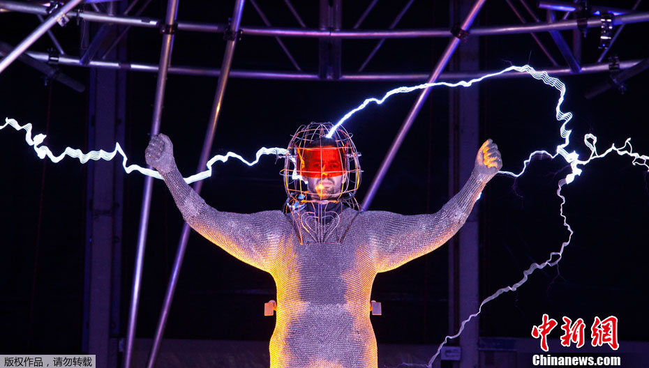当地时间2012年10月5日,美国纽约,美国魔术师大卫·布莱恩再次挑战人类极限,接受100万伏高压电72小时持续电击。布莱恩身着网眼金属外套,头戴金属笼头罩,站在高台上承受巨伏电压“折磨”,这三天中布莱恩不眠不食,只通过导管喝水。