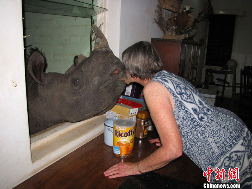当地时间2012年12月5日报道,犀牛是自然界中具有攻击性的动物,你几乎无法想象它能够与人类和平相处。然而来自津巴布韦的71岁老妇人Anne Whittall却与一只名叫Jimmy的犀牛产生了深厚的友情,它们在一起共同生活,成为彼此的牵绊。这只“温顺”的犀牛经常出现在Anne的房间中,不时用自己的头部磨蹭Anne的身体表示亲昵和友好,它最喜欢从厨房的窗户中伸出头部探头探脑。