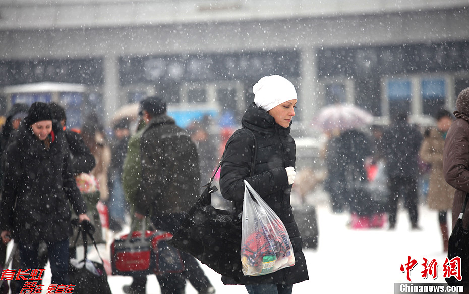 12月20日,山西太原气温降至零下9度,迎来强降雪。中央气象台12月20日06时继续发布寒潮蓝色预警,受强冷空气影响,预计12月20日08时至22日08时,西北地区大部、内蒙古、华北中北部、东北地区大部等地气温将先后下降6~8℃。图为山西太原火车站出站的外国人。中新社发 郭泽源 摄
