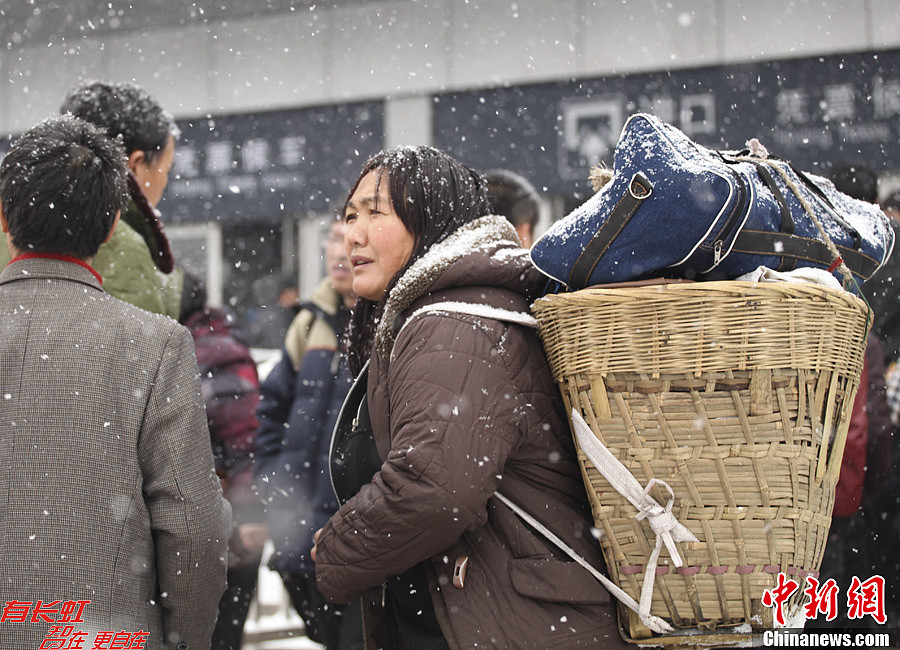 12月20日,山西太原迎来入冬最强降雪,在太原火车站,农民工雪中返乡。中央气象台预报20日白天到夜间,中东部地区将有大范围的雨雪,雨雪分界线在秦岭淮河一带,以北地区将以降雪为主,以南则维持阴雨天气,其中,北方的省会城市中除银川外基本都将出现降雪。中新社发 刘佳 摄