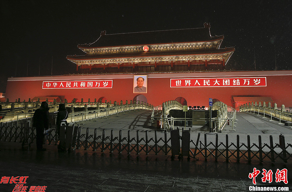 12月20日傍晚,北京市降下小雪,天安门城楼前已能看到积雪。北京市气象局当日下午发布寒潮蓝色预警和道路结冰黄色预警。受强冷空气影响,21日夜间开始,北京气温将持续下降,22日、23日城区最低气温将下降至-13℃至-15℃,并伴有4、5级偏北风。中新社发 张浩 摄