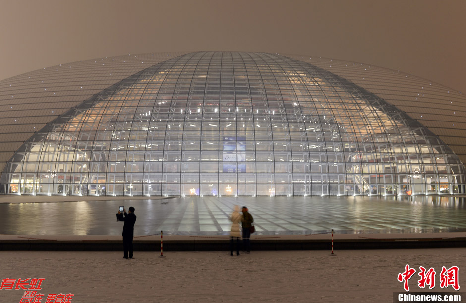 12月20日晚,几名市民在北京国家大剧院前驻足游览,当晚北京又迎来新一轮降雪。中新社发 刘震 摄