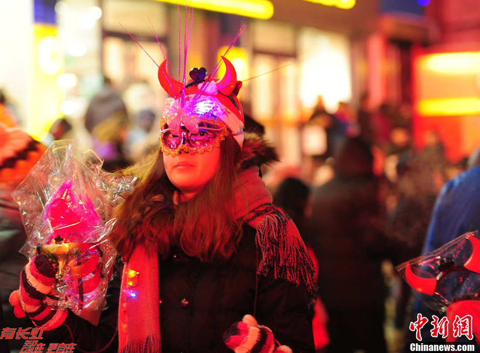 12月24日晚,辽宁省沈阳市,在中街商业街上,超过万人出行逛街、购物等活动来庆祝“洋节”平安夜的到来。各种形象的圣诞老人出现在街头,与市民欢度平安夜。图为市民在逛街。中新社发 于海洋 摄