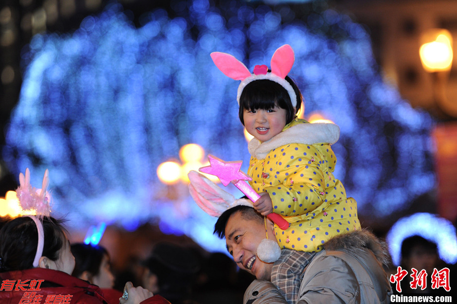 12月24日,平安夜,在拥堵的人群中,一小女孩高高兴兴地坐在自己父亲肩膀上,母亲正在为她拍照留念。重庆主城各大商圈灯火璀璨、欢乐四溢。解放碑步行街浓厚的节日氛围,吸引众多市民前往庆祝。图为小女孩坐在父亲肩膀上母亲为她拍照留念。中新社发 陈超 摄