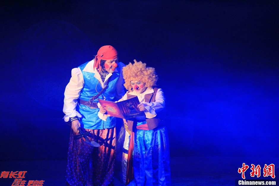 12月24日晚,一场融合中西文化的平安夜狂欢西安上演。在位于西安东郊的兴庆公园,来自俄罗斯、法国、美国等10余个国家上百位马戏明星正在上演马术、空中飞人、高空钢丝、手技、魔术、驯兽、滑稽小丑等节目。图为外国小丑查看“藏宝图”。 张一辰 摄