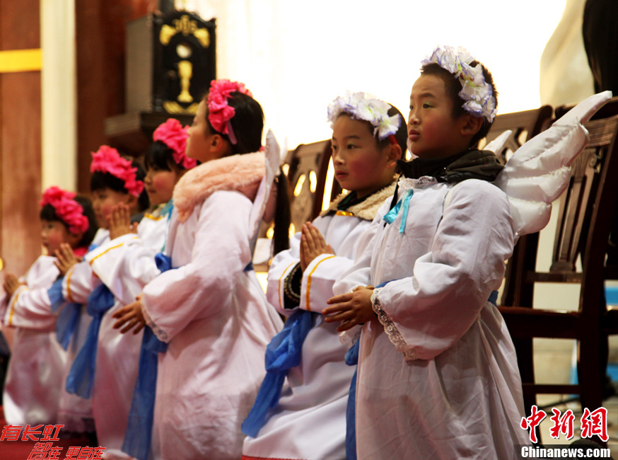 12月24日晚,贵阳市现存历史最长,中西建筑风格合璧的和平路天主教堂内灯火通明,大量民众和天主教徒汇集在此,参加弥撒圣祭,共同度过平安夜。图为参加祈祷的“小天使”。中新社发 李桐 摄