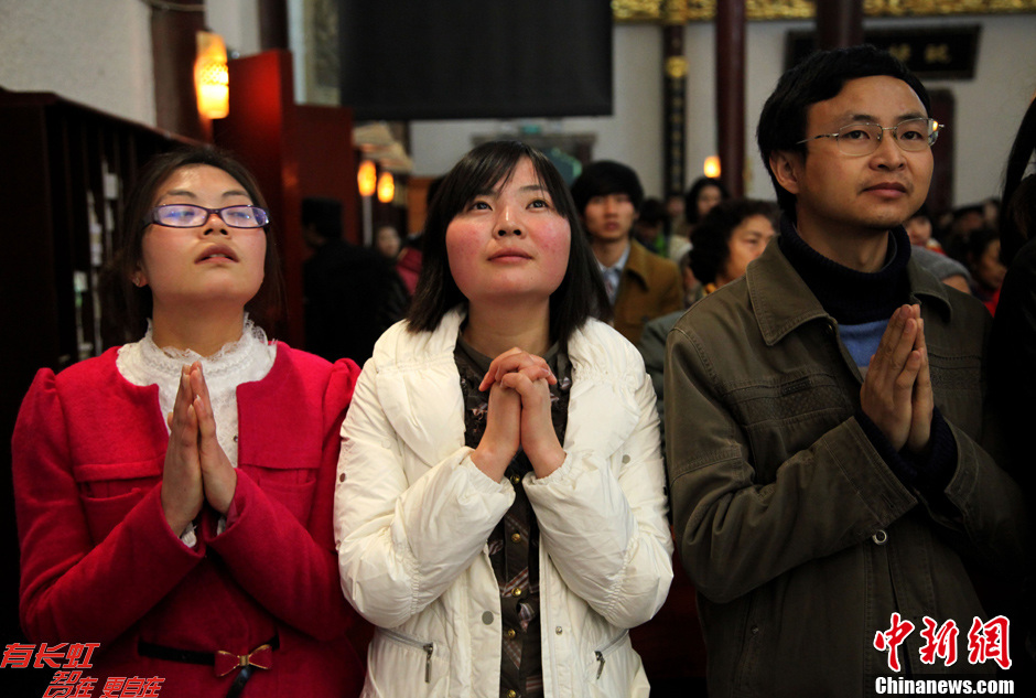12月24日晚,贵阳市现存历史最长,中西建筑风格合璧的和平路天主教堂内灯火通明,大量民众和天主教徒汇集在此,参加弥撒圣祭,共同度过平安夜。图为虔诚祈祷的信徒。中新社发 李桐 摄