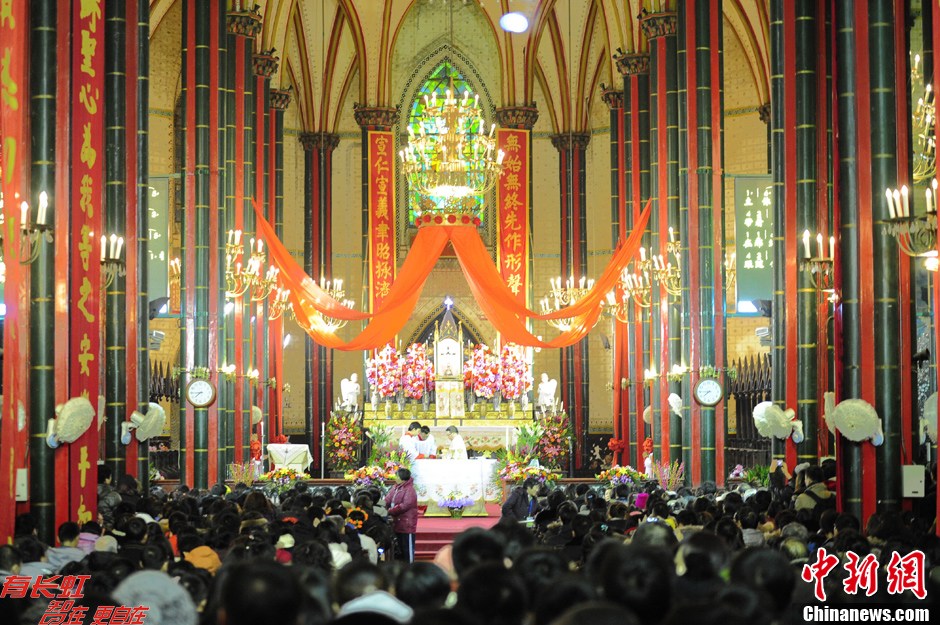 12月24日,尽管北京当日夜间气温跌破零下十度,依然难挡众多北京市民和信众前往教堂观摩弥撒。当日是西方传统节日圣诞节的前夜,也称平安夜。而在北京市著名的西什库天主教堂,大量民众进入教堂内体验圣诞节平安夜的节日气氛。图为西什库天主教堂内正在进行弥撒仪式。中新社发 崔楠 摄