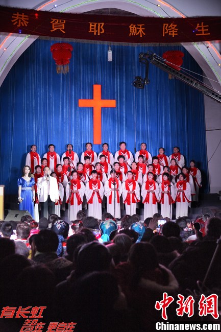 12月24日,西方一些国家的“平安夜”。近年来,在中国国内,越来越多的人把“平安夜”“圣诞节”当做自己的节日来度过,西方节日渐渐中国本土化。图为呼和浩特一基督教堂,信徒正表演“平安夜”的节目。中新社发 刘文华 摄