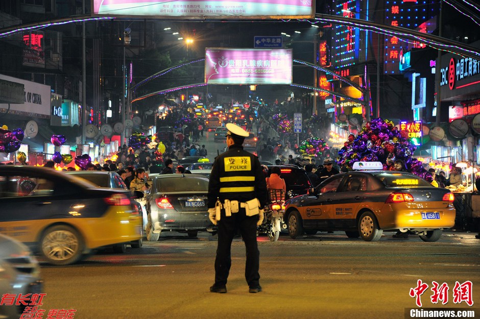 2012年12月24日贵阳市民欢度“平安夜”,在贵阳市中心城区的道路被前来欢度“平安夜”的市民堵得水泄不通。平时擦肩而过的路人在此时会停下来,用手中的“雪花弹药”向对方“问好”。图为在平安夜里坚持上岗维持秩序,保持道路畅通的交警。中新社发 王顺芝 摄