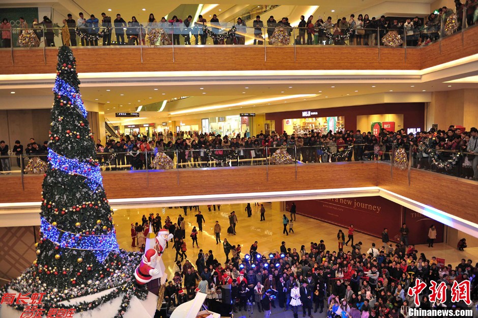 12月24日,广西南宁,市民扎堆商场观看表演,度过平安夜。中新社发 洪坚鹏 摄