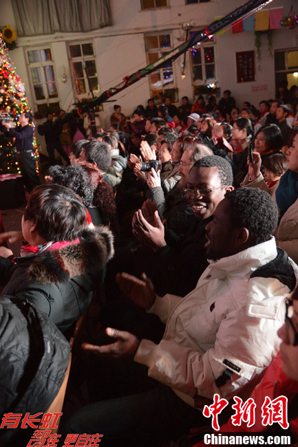 12月24日,西方一些国家的“平安夜”。近年来,在中国国内,越来越多的人把“平安夜”“圣诞节”当做自己的节日来度过,西方节日渐渐中国本土化。图为呼和浩特一基督教堂,一些外国人正在开心的观看“平安夜”的节目。中新社发 刘文华 摄