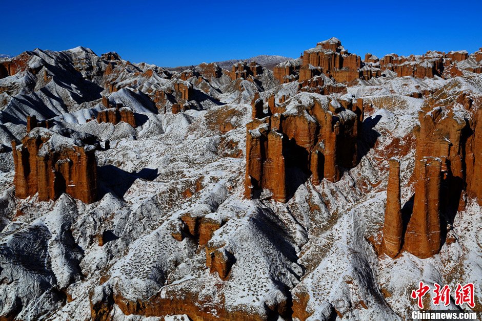 近日,一场席卷西北的大雪过后,祁连山峦披上了银装,显得格外妖娆,当地著名的张掖丹霞冰沟景区,白雪、丹霞、碧天三者相映成趣,更是美不胜收。成林 摄