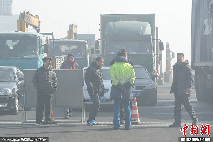 1月13日,雾霾继续在我国大范围弥漫,东北、华北、黄淮、长江中下游及华南地区持续有雾,中央气象台6时继续发布大雾黄色预警,预计雾霾将盘踞中东部地区数日。多地城市陷入严重空气污染。图为1月12日,青岛,胶州湾大桥收费站口几名车主下车向工作人员询问通行时间。于滈 摄 图片来源:CFP视觉中国