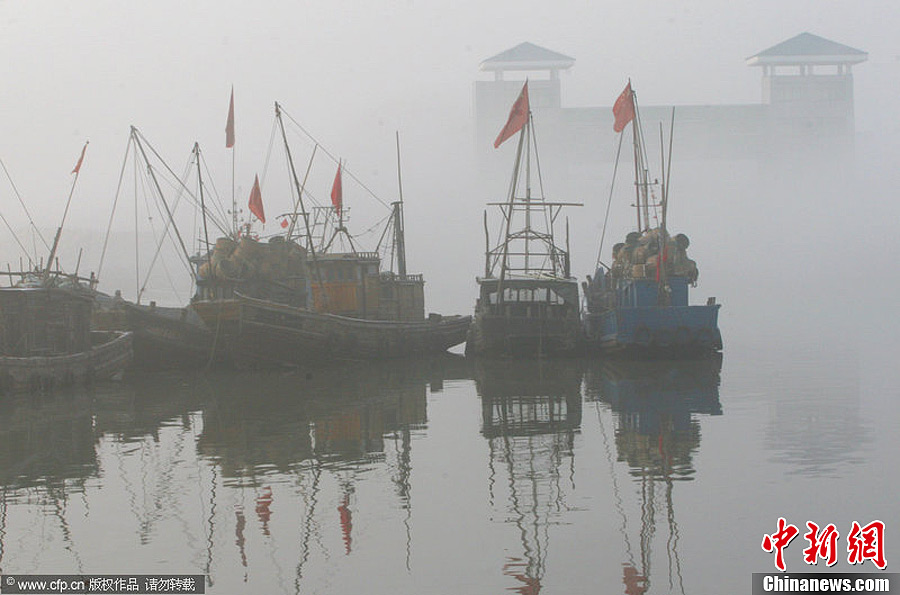 1月13日,雾霾继续在我国大范围弥漫,东北、华北、黄淮、长江中下游及华南地区持续有雾,中央气象台6时继续发布大雾黄色预警,预计雾霾将盘踞中东部地区数日。多地城市陷入严重空气污染。图为1月13日,江苏连云港市西墅渔港码头被大雾笼罩。耿玉和 摄 图片来源:CFP视觉中国