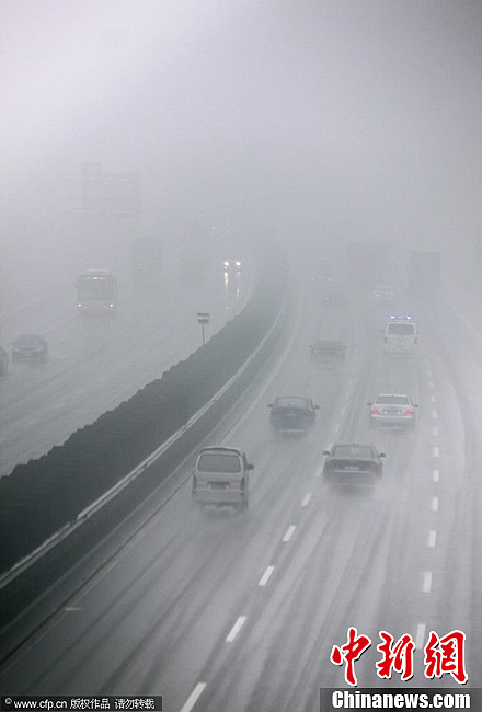 1月13日,雾霾继续在我国大范围弥漫,东北、华北、黄淮、长江中下游及华南地区持续有雾,中央气象台6时继续发布大雾黄色预警,预计雾霾将盘踞中东部地区数日。多地城市陷入严重空气污染。图为1月13日,江苏南通,车辆行驶在大雾弥漫的沈海高速苏通大桥南通段。朱吉鹏 摄 图片来源:CFP视觉中国