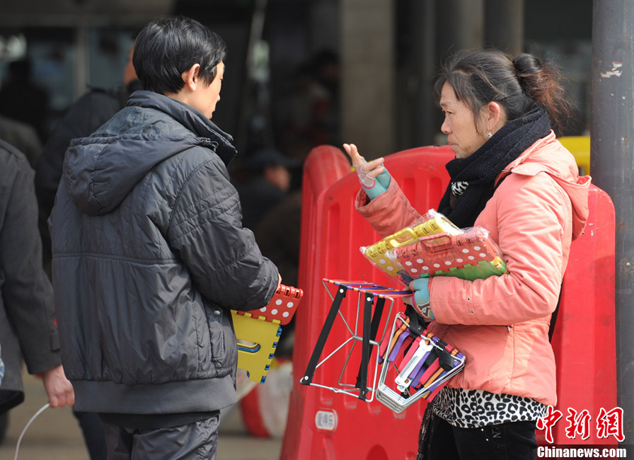 1月26日,2013年春运大幕正式开启。在长沙火车站前,一位准备搭乘火车的乘客正在与“板凳”贩卖商谈价。在春运时期,这种便携式小板凳变成了“无座”人员必不可少的工具。中新社发 杨华峰 摄