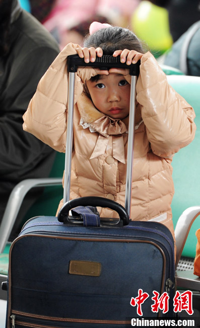 1月26日,2013年春运拉开帷幕,作为全球最大的“人口迁移”,过年回家总能牵动众多中国人的心。图为长沙火车南站的一只小“候鸟”双手握住行李等待列车到来。中新社发 杨华峰 摄