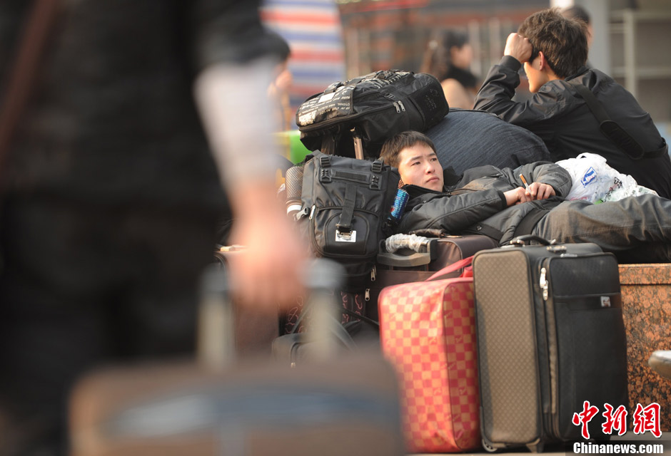 1月26日,2013年为期40天的春运正式启动,重庆火车北站旅客逐渐增多。图为火车北站一市民躺在行李箱上等待回家的列车班次。中新社发 陈超 摄