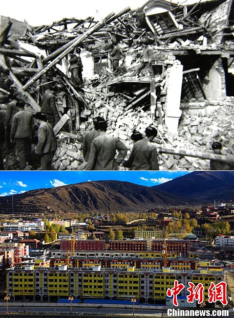 2月6日,四川甘孜藏族自治州炉霍县发生地震40周年,当地社会各界千余民众聚集一起,缅怀在地震中遇难的同胞,感恩救灾的救援者。经过40年的建设和发展,如今炉霍震灾区已发生了翻天覆地的变化。1973年2月6日18时37分05秒,炉霍县发生7.9级地震,灾难造成当地2204人遇难,绝户80户,遗留孤儿43人,县城也被夷为平地。上图为地震中倒塌的房屋,下图为40年后炉霍城内新建的廉租房。(拼版图片)中新社发 杨孝康 摄