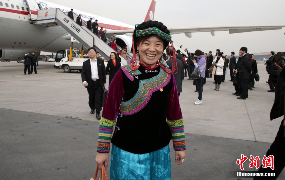 3月2日,参加十二届全国人大一次会议的四川省代表团抵达北京首都机场,全国人大代表骆云莲(彝族)走下飞机。中新社发 杜洋 摄
