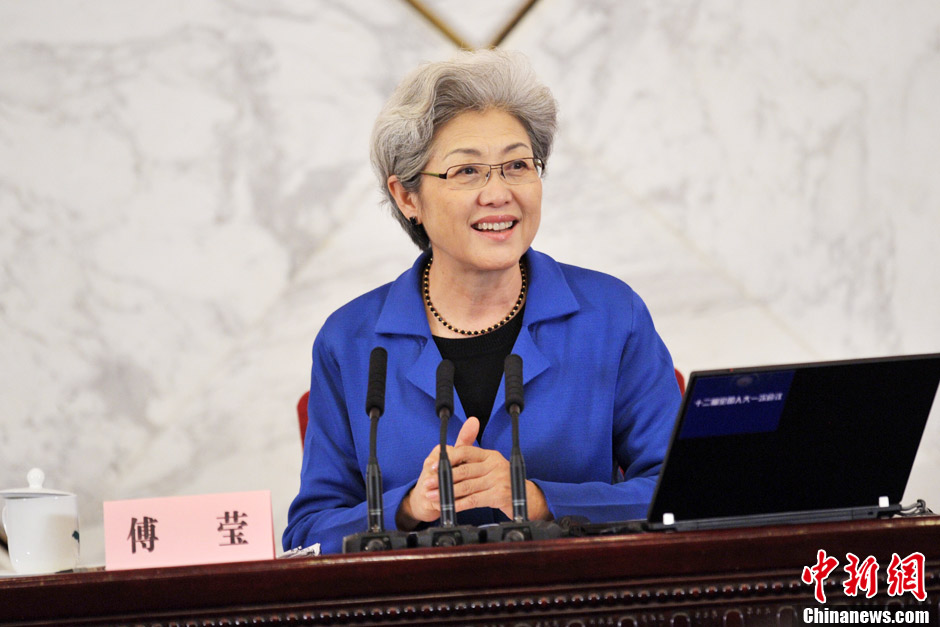 3月4日,十二届全国人大一次会议在人民大会堂一层新闻发布厅举行新闻发布会,由大会发言人就会议议程和人大工作相关的问题回答中外记者的提问。图为十二届全国人大一次会议副秘书长、新闻发言人傅莹亮相并答问。中新网记者 金硕 摄