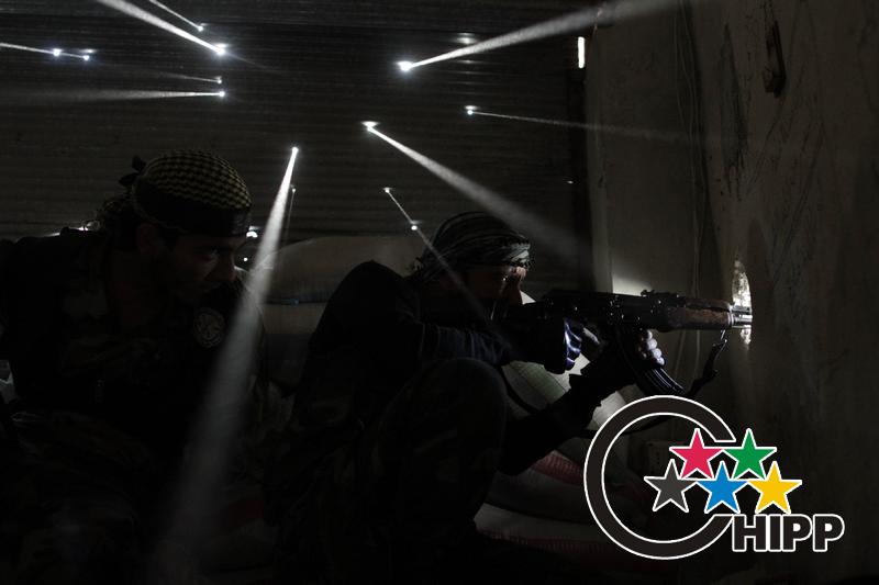 2012年10月18日,在叙利亚阿勒颇中心的争夺地带,两名叙利亚反政府武装士兵从一处狙击地点向外瞄准。图片来源:华赛网