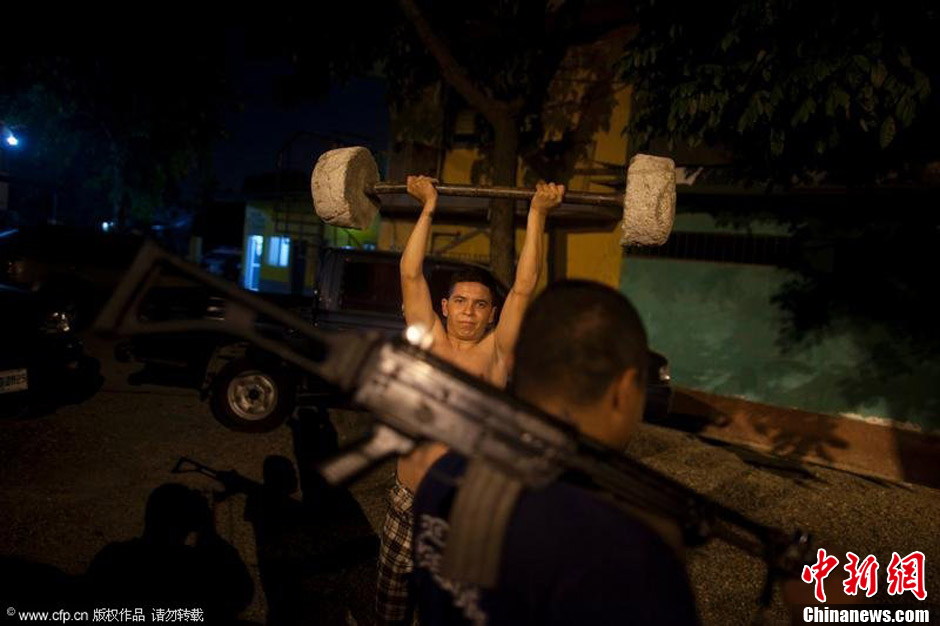 2012年3月8日,在洪都拉斯圣佩德罗苏拉警察局,一名警官用混凝土做成的杠铃举重。