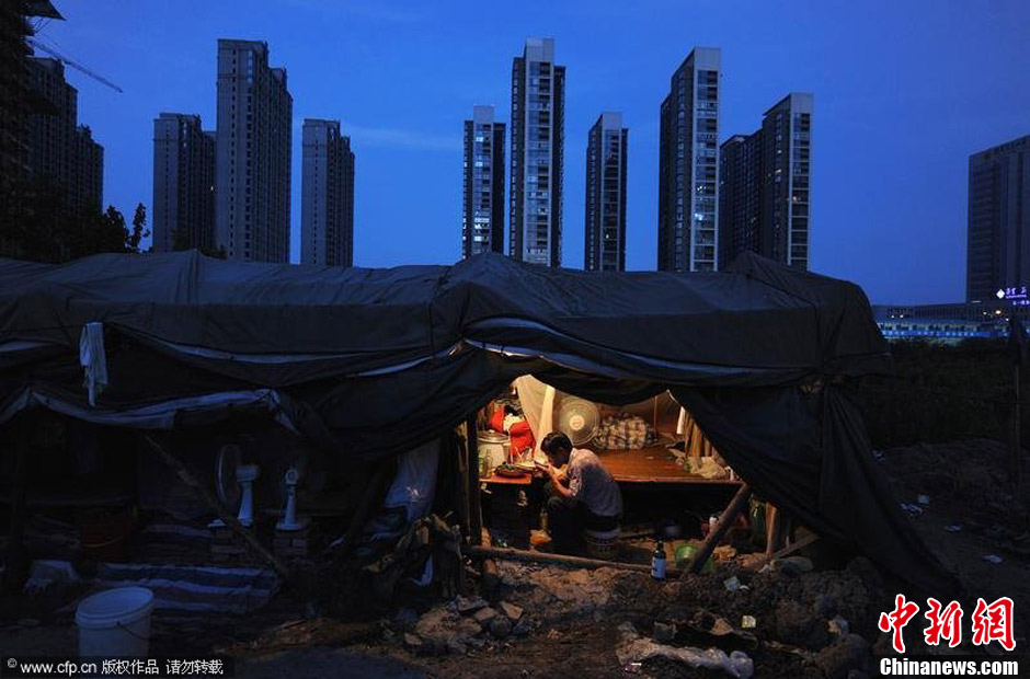 2012年7月26日,安徽合肥闹市中,一民工在工棚里用晚餐。身后的高楼为他们所建,但却没有他们容身之地。吴芳 摄 图片来源:华赛网