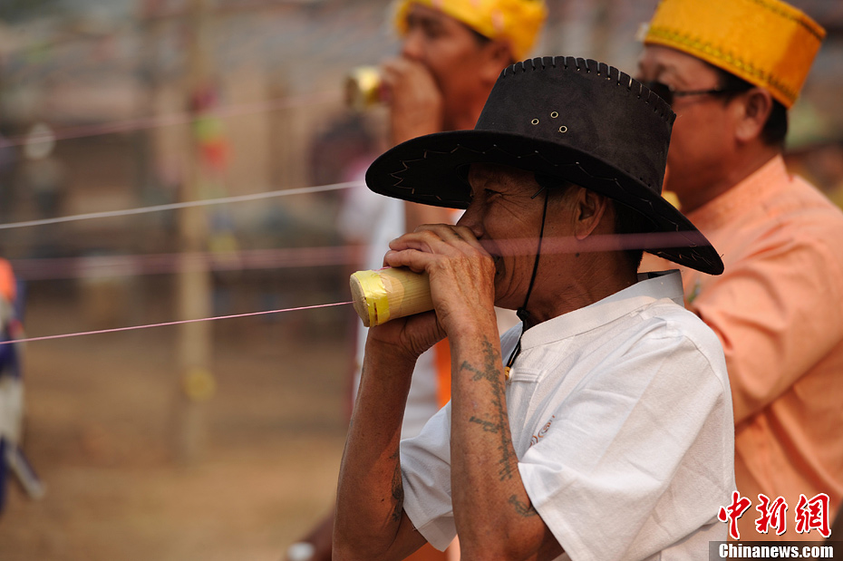 4月11日,云南德宏州芒市傣族村寨的男女老幼,在泼水节准活动的现场打起“土电话”,通过竹筒间的一根棉线对歌传情,演绎别样的傣家浪漫。一年一度的傣族泼水节即将到来。中新社发 刘冉阳 摄