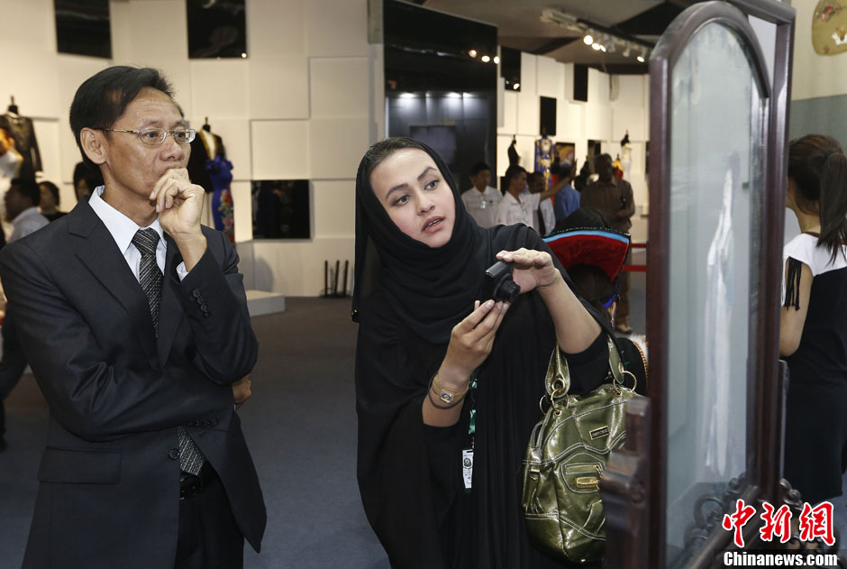 当地时间4月11日,沙特利雅得,2013年沙特杰纳第利亚遗产文化节中国主宾国馆迎来大使日,中国驻沙特大使李成文邀请驻沙特各国使节参观中国馆,体验悠久的中华文化。图为来宾欣赏湘绣“双面绣”。中新社发 杜洋 摄