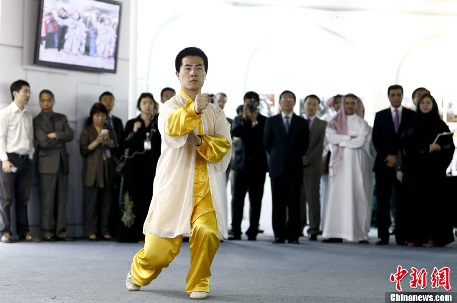 当地时间4月11日,沙特利雅得,2013年沙特杰纳第利亚遗产文化节中国主宾国馆迎来大使日,中国驻沙特大使李成文邀请驻沙特各国使节参观中国馆,体验悠久的中华文化。中新社发 杜洋 摄