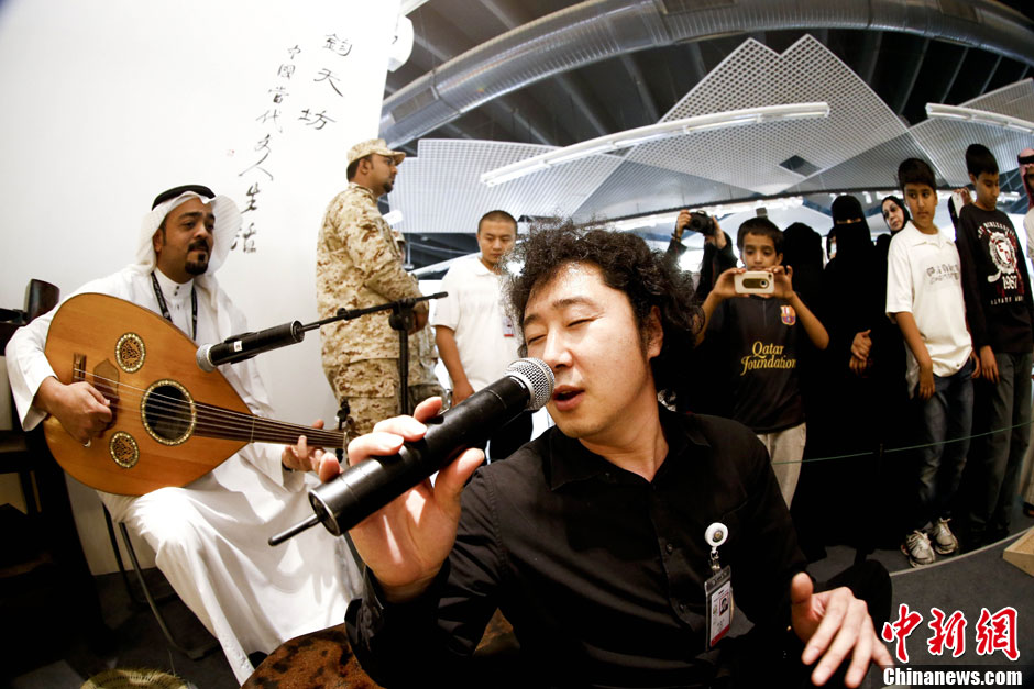 当地时间4月11日,沙特利雅得,2013年沙特杰纳第利亚遗产文化节中国主宾国馆,来自中国和沙特的音乐家现场互动交流,一首即兴合奏的歌曲吸引了众多参观者。中新社发 杜洋 摄