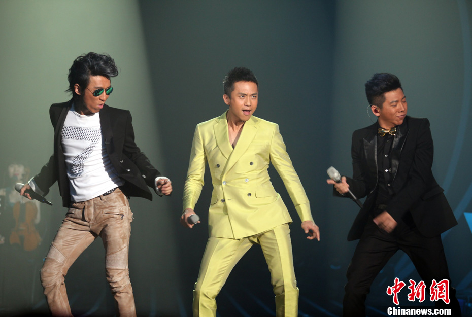 4月12日晚,中国大陆颇受欢迎的男声音乐组合羽泉,用他们的歌喉征服了500位现场观众,摘取了《我是歌手》的冠军。图为总决赛上,羽泉携手演员邓超演唱了自己的经典歌曲《奔跑+冷酷到底》。 中新社发 湖南卫视供图