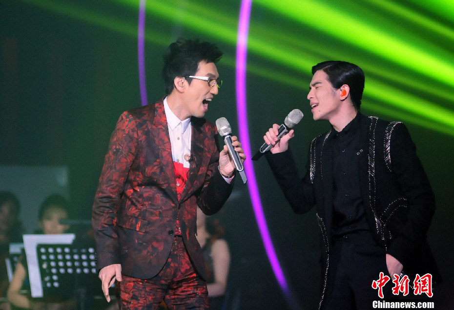 4月12日晚,《我是歌手》总决赛的“帮帮唱”环节中,林志炫搭档萧敬腾献唱《EASY LOVER》。当晚,羽泉组合击败其他六位实力强劲的歌手,获得“歌王”称号。中新社发 湖南卫视供图