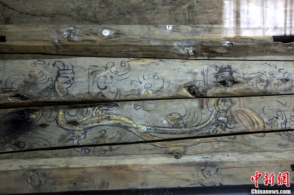 嘉峪关魏晋壁画墓:出土棺木内饰伏羲女娲图