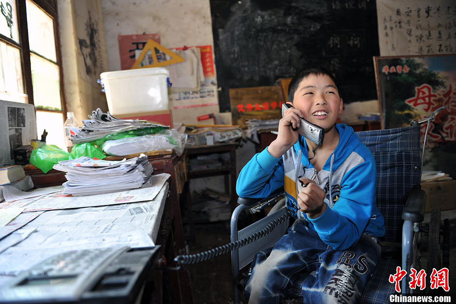 在外打工挣钱的爸爸妈妈外,经常会给小宗成打来电话,询问病情和生活的一些情况,每当接到电话的时候,小宗成的脸上总是布满了幸福的笑容,爸爸妈妈是小宗成的支柱,每次电话都能让小宗成觉得,至少,爸爸妈妈不曾放弃他,不曾忘却他。胡影 摄