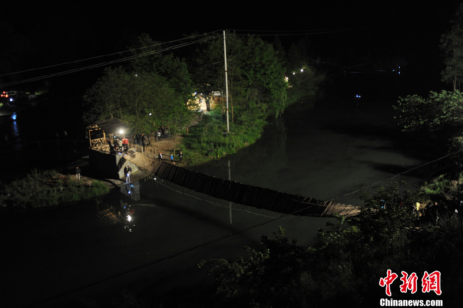 5月1日晚9时10分许,湖南省凤凰县沱江镇棉寨村距县城3公里处桃花岛篝火晚会散场时,游客经近水吊桥时因桥头受力桩断裂,出现桥面倾斜,导致部分游客落水。截至2日凌晨4点30分,沱江下游的3个乡镇搜救队未发现有人溺水死亡等异常情况,目前仍在进行搜寻。杨华峰 摄
