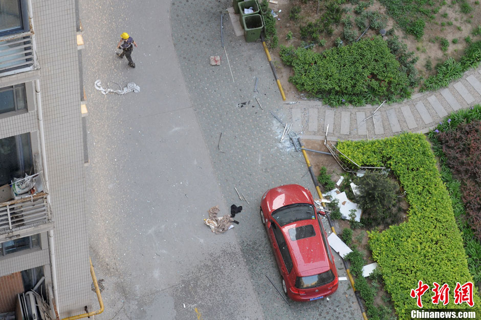 5月2日下午16时05分许,位于西安市经开区北二环东段的名流水晶宫大厦三单元20楼一住户室内突发天然气泄漏爆燃事故。据附近楼内居民介绍,爆炸发生时伴有很大的响声,楼体发生晃动,一度误以为是地震。搜救人员从事故现场救出一人,已被送往医院救治。图为掉落至楼下的窗框等物。张远 摄