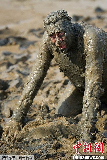 当地时间2013年5月5日,英国南部莫尔登举行一年一度的泥巴大赛,人们造型各异在黑水河河滩上参加比赛。