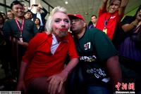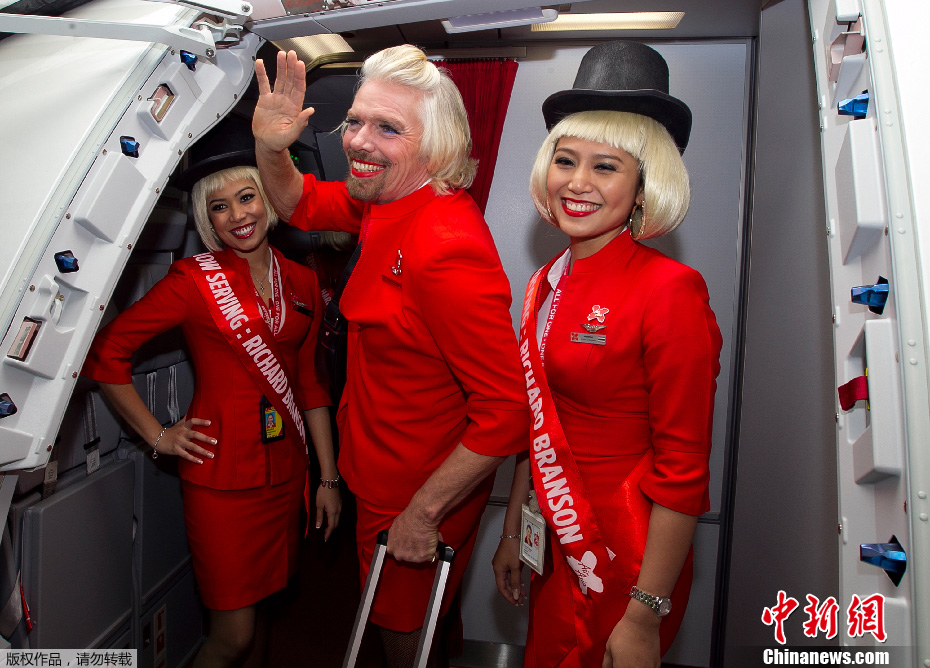 当地时间2013年5月12日,马来西亚吉隆坡廉价机场(LCCT),英国亿万富翁理查德·布兰森与人打赌“失败”,打扮成空姐将为乘客服务。“输家”布兰森,维珍集团创始人,素以时尚性感形象示人;“赢家”托尼·费尔南德斯,马来西亚亚洲航空公司创始人。早些时候,布兰森与费尔南德斯打赌,赌谁的车队能够在一级方程式赛车中获胜,结果布兰森惨败。