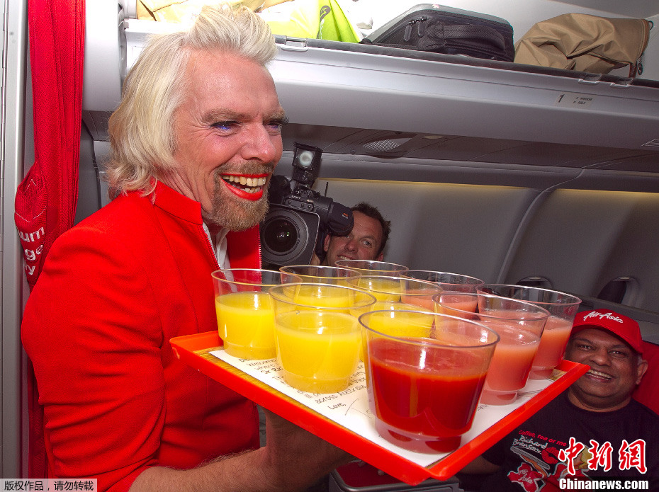 当地时间2013年5月12日,马来西亚吉隆坡廉价机场(LCCT),英国亿万富翁理查德·布兰森与人打赌“失败”,打扮成空姐将为乘客服务。“输家”布兰森,维珍集团创始人,素以时尚性感形象示人;“赢家”托尼·费尔南德斯,马来西亚亚洲航空公司创始人。早些时候,布兰森与费尔南德斯打赌,赌谁的车队能够在一级方程式赛车中获胜,结果布兰森惨败。