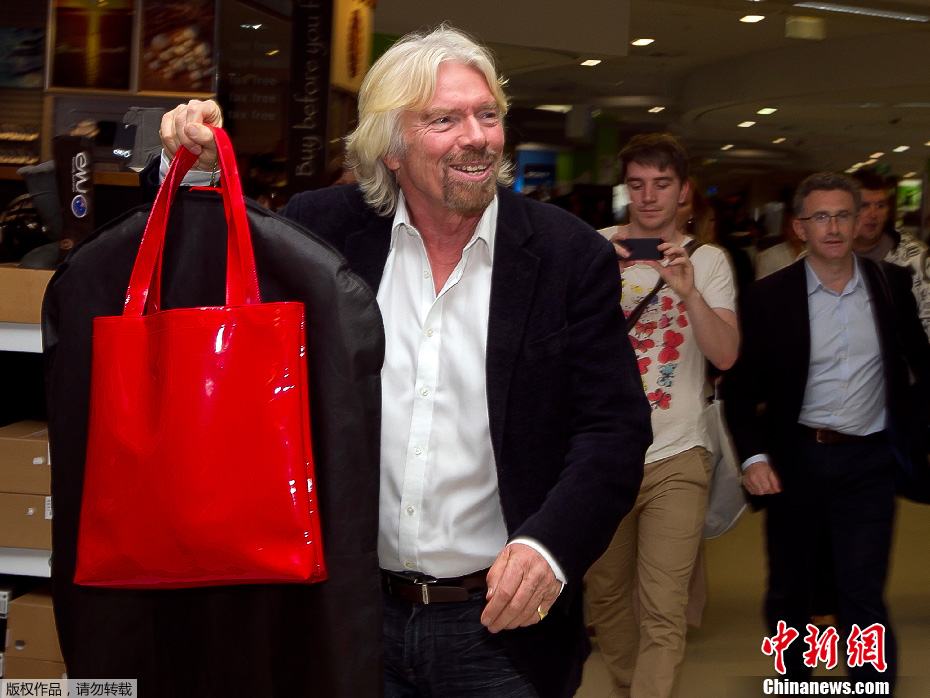 当地时间2013年5月12日,马来西亚吉隆坡廉价机场(LCCT),英国亿万富翁理查德·布兰森与人打赌“失败”,打扮成空姐将为乘客服务。“输家”布兰森,维珍集团创始人,素以时尚性感形象示人;“赢家”托尼·费尔南德斯,马来西亚亚洲航空公司创始人。早些时候,布兰森与费尔南德斯打赌,赌谁的车队能够在一级方程式赛车中获胜,结果布兰森惨败。