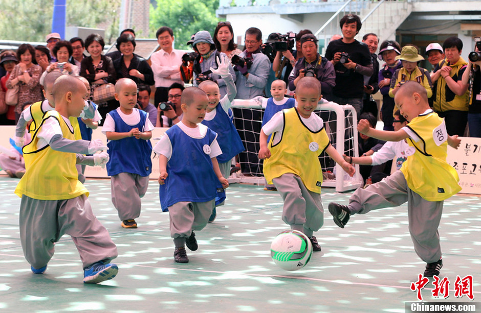 当地时间2013年5月14日,韩国首尔,曹溪寺大雄殿前院举办“第2届小和尚足球赛”,小和尚动作灵活,表情超可爱。图片来源:东方IC 版权作品 请勿转载