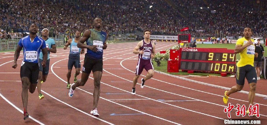 北京时间6月7日凌晨,在2013年国际田联钻石联赛罗马站100米比赛中,加特林9秒94获得冠军,而博尔特以9秒95获得亚军。在8月份进行的莫斯科田径世锦赛中,加特林将对博尔特形成很大的威胁。图片来源:Osports全体育图片社