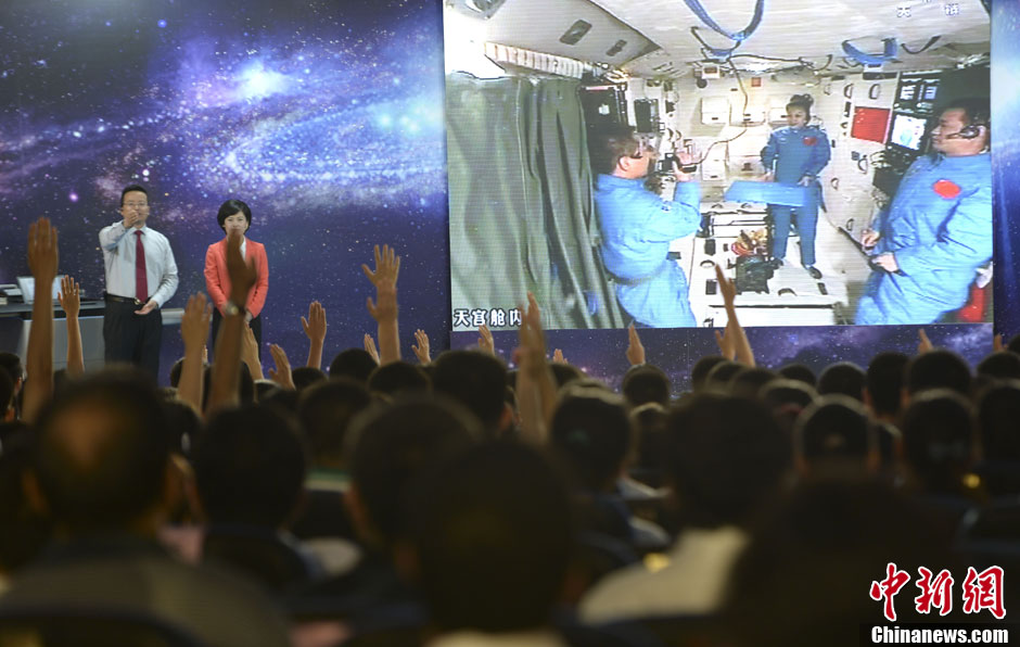 6月20日10时许,神舟十号航天员在天宫一号开展基础物理实验,为青少年进行中国首次太空授课。中国8万余所中学6000余万名师生同步收听收看。图为北京人大附中天地互动现场。廖攀 摄