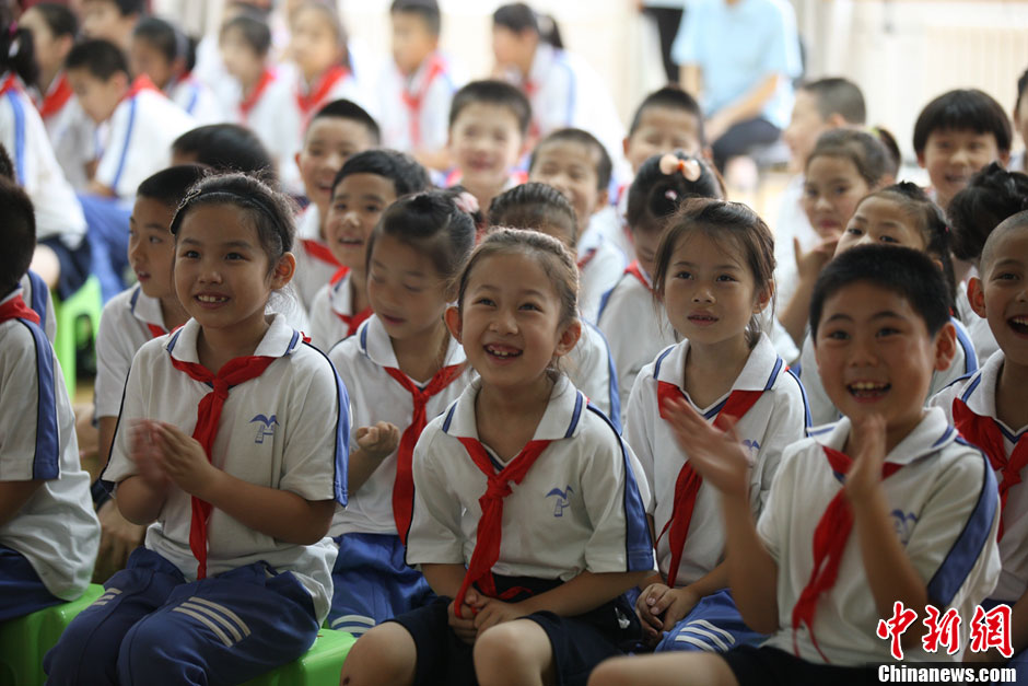 6月20日上午,“神十”女航天员王亚平在进行太空授课,从而成为中国首位“太空教师”,天宫一号也因此成为中国“最高”讲台。图为北京市育鸿学校组织中小学生收看太空授课。中新社发 孙阳 摄